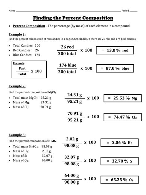 Creating a chemistry percent composition worksheet is relatively easy and straightforward. The first step is to determine the elements that make up the compound, and the percentages of each element. Once the elements and percentages are determined, the next step is to put the data into a chart. This chart should include the elements, their percentages, and the total percentage of the compound. Once the chart is completed, the next step is to fill out the worksheet with the data from the chart.